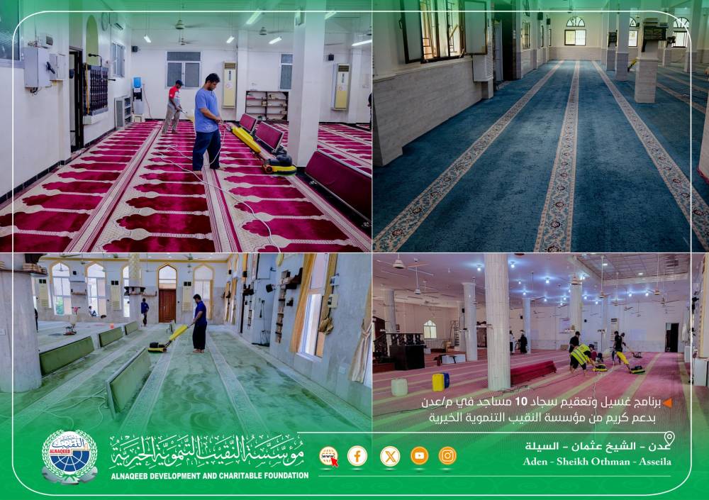 بالتنسيق مع قطاع الأوقاف: مؤسسة النقيب تدشّن برنامج غسيل وتعقيم سجاد 10 مساجد في عدن